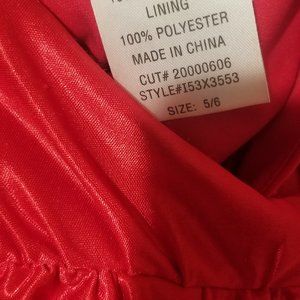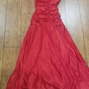 Red, full length dress, worn to Prom an age ago and selling now. It was purchased from Ross years ago, but is in good condition as it's spent quality time in a closet. Stretch satiny material, full length. For reference, I'm 5'3", 120 lb (160 cm/56 kg) and needed to wear 2" heels with the dress. In good condition.