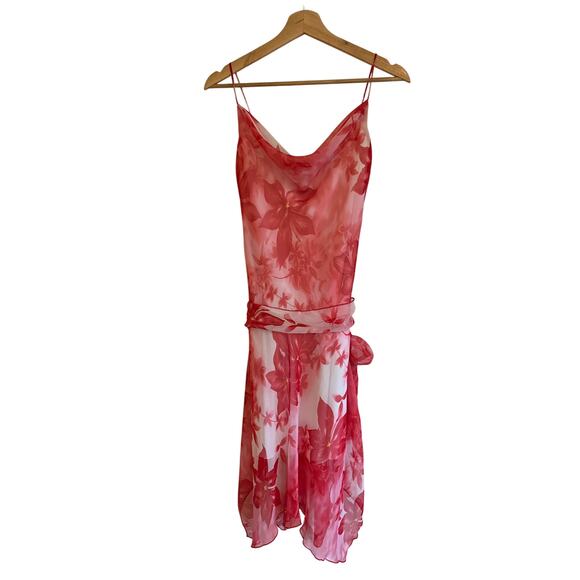 Vintage Y2K B. Smart Pink Floral Chiffon Dress – Cowl Neck, Scarf‑Hem, Bow Tie Waist Juniors size 9/10 (see measurements below). 9/10 (M/L) juniors is similar to a 6/8 women's (M).