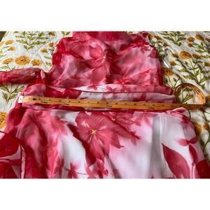 Step into fairycore elegance with this vintage Y2K B. Smart chiffon midi dress. Crafted from soft, flowy 100% polyester chiffon with a smooth lining, it features a dreamy cowl neckline, delicate spaghetti straps, and a romantic scarf handkerchief hem. The bold pink-red hibiscus floral print on a white base brings whimsical, cottagecore vibes, while the adjustable bow belt cinches the waist for flattering definition. The dress has some stretch to it so it could work across a few sizes depending on the fit you are looking for.