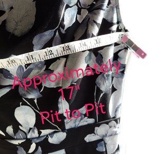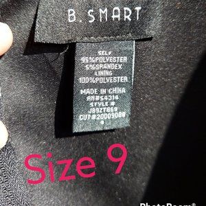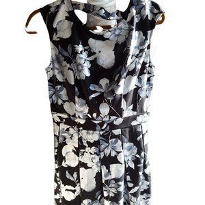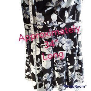 B. Smart sleeveless black dress with silver flowers - NWT. Fully lined dress with pleated front and back skirt below the waist band. This is a very stunning dress with the silver metallic like flowers throughout the dress. The back has a zipper closure and back strap across the neck. Would be a great dress for any special occasion.