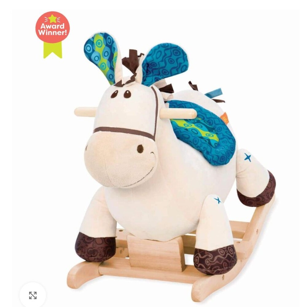 Saddle up and take a ride on the Banjo Rodeo Rocker! This plushy rocking horse is a timeless playroom companion for little ones to enjoy. Banjo is equipped with natural hardwood handles and rockers that give this ride-on toy a classic feel. Settle into the comfy seat, listen to the clip-clop of your horses hooves, and turn on your imagination. Show off your cowboy skills at a rodeo, gallop through the scorching desert of the Wild West, or trot through meadows filled with flowers. Yee-haw! And because we at B. keep the environment in mind, parents will also be happy to know that our packaging is 100% recyclable. Recommended for toddlers 18 months and over.