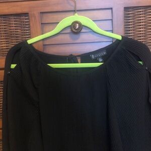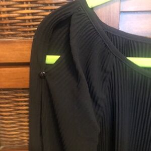 Perfect top for Date Night! Accordion pleats create flattering interest in the top while the bottom flows in the breeze. The billowy sleeve come down to and are brought in by the elastic around the wrist. The shoulders have small openings held together by a tiny button and the neckline has a tie in the back creating a romantic touch. The top is a solid black and the fabric is a textured polyester. The length is 28"