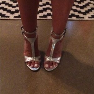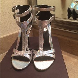 B by Brian Atwood metallic t-strap sandals from Neiman Marcus. Silver leather lining and black sole with 4.5' heel. Value of $398, wore only 2 times.