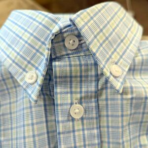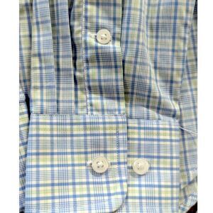 This NWT B by Brooks Brothers shirt offers timeless style with a crisp blue and green plaid pattern. Crafted in a comfortable cotton-blend fabric, it features a button-down collar, full button front, and adjustable cuffs. Original $50 tag still attached.