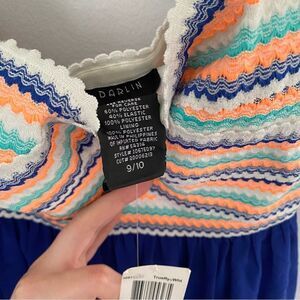 Colorful stretchy body with blue tutu like skirt. Mini length