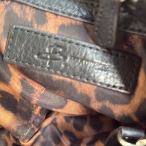 Black leather with studs and suede side pockets. Check out the pictures. This bag is in good condition. Inside is very clean measuring across the bag on the bottom is 13 measuring with the side pocket flatten is 15 x 11.5 x 4. Handle drop is 10. Measurements are approximate.
