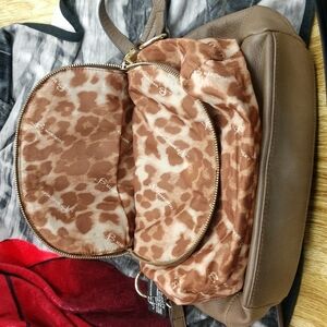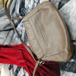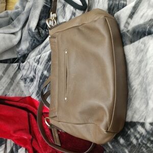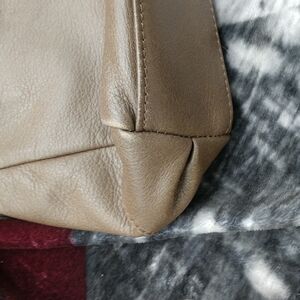 very soft tampers with brown stitching Gold hardware. inside is clean and out with magnetic latch and good use condition no marks noted 11 inches across 8 in deep