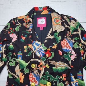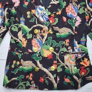 This colorful blazer features a bold animal/circus design and is so bright and fun.