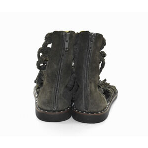 AUTHENTIC JEFFREY CAMPBELL Olive Green Suede Braided Straps Fringe Antiqued Metal Rivets Around The Edge Back Zipper Sandals