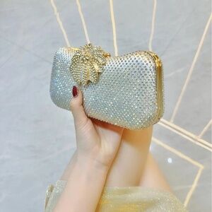 Elevate your evening look with this luxury crystal rhinestone clutch, designed to shimmer under the lights. This dazzling purse is covered in sparkling rhinestones and features an exquisite gold leaf accent clasp, adding elegance and sophistication. Compact yet spacious enough for your essentials, it’s perfect for weddings, cocktail parties, proms, and glamorous nights out. A true statement accessory that pairs beautifully with gowns, dresses, and chic evening wear.