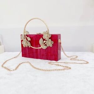 Red acrylic evening bag, floral gold handle clutch, structured party purse