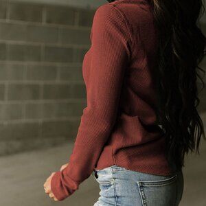 B027 Brown Trimmed Neckline Waffle Knit Henley Top