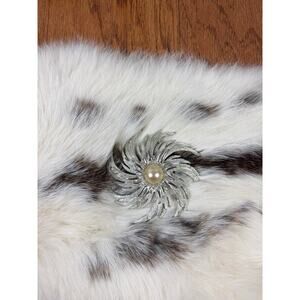 B10 Sarah Coventry Faux Pearl Flower Brooch Womens Pinwheel Swirl Silver Tone