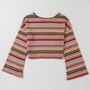 B159 Rose Red Ethnic Striped Wide Cropped Long Sleeve Top