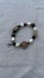 Elegant beaded bracelet featuring a floral charm. Accented with white and brown beads.