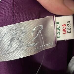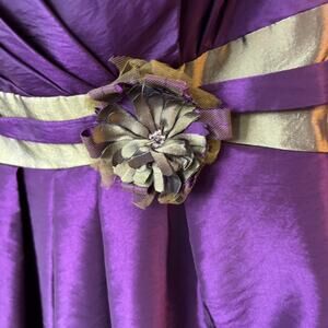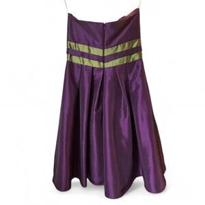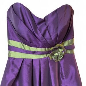 B2 shimmery deep purple strapless sweetheart neckline satin homecoming/party dress with bright lime green waist tie and flower detail. So stunningly Y2K! An “alternative” girly definitely wore this to homecoming in 2004.
