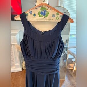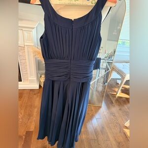 JUST DRY CLEANED This stunning navy blue cocktail dress features elegant pleating and ruching details, perfect for a wedding guest or cocktail occasion. The sleeveless design with a scoop neckline adds a touch of sophistication, while the flowing skirt creates a graceful silhouette. * I have a matching size junior 8 in my closet if you want a mother daughter match