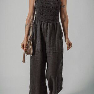 B249 Black Spaghetti Straps Shirred Bodice Pocketed Wide Leg Jumpsuit