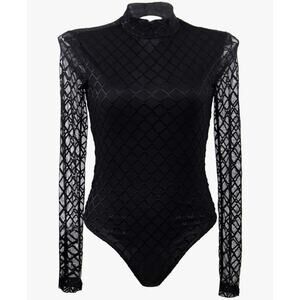 This plus size, black bodysuit features a high cut neck, patterned mesh sleeves, and a cheeky back.
