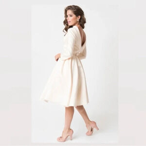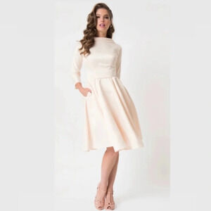 A vintage vision fresh from Unique Vintage, the Lana Dress is a fabulous 1950s-style bridal dream. It is crafted from a gorgeous cream poly-satin, which is perfect for your very special occasion. The high bateau neckline features a darling fold-over cowl that cascades to the back in a sultry V design. A hidden back zipper nips in your waist while two sweet bows snap over it for an angelic vintage embellishment. The bodice is darted for a flawless fit while the three-quarter-length sleeves frame your beautiful silhouette. The seamed and piped waist showcases your hourglass figure and tops a box and knife pleated swing skirt that drops to your knees. This vintage-style dress is fully lined for magnificent comfort and outfitted with hidden side pockets.