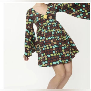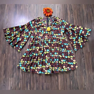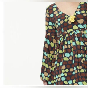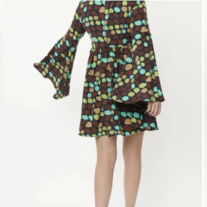 This dress is crafted in a smooth woven fabric bursting with a geometric pattern in brown, pink, taupe, and teal throughout the navy backdrop. The V-neckline is centered by a removable pin rose and framed by marvelous bell sleeves. Complete with back zipper and side pockets.