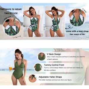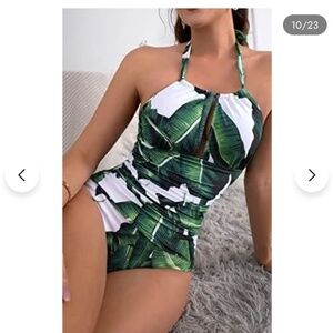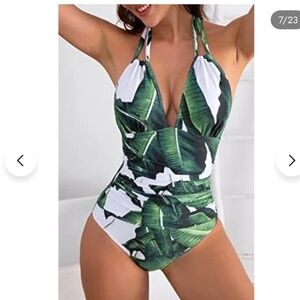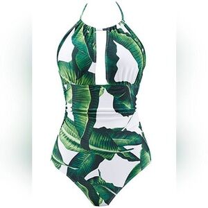 B2PRITY Tropical Palm Frond Leaf V-Neck Ruched Halter 1pc Monokini medium NWT