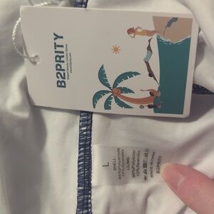 NWT. Navy blue and white tropical floral print one piece bathing suit by B2prity. Has gold bar in between each breast. Small amount of gathering on each side. Size is a Large.