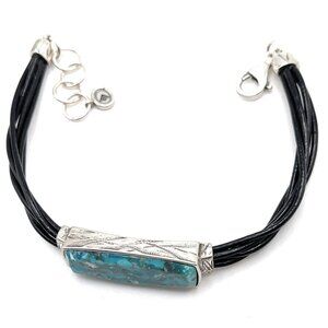 Stabilized Turquoise with a black leather straps, it is 7-8 inches long with a lobster claw clasp. In new condition.
