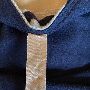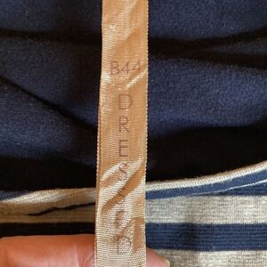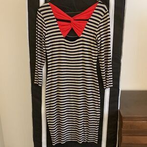 B44 Dressed, black/gray stripe, 3/4 sleeve dress with round front neckline and round back with open red twisted bow. Fully lined. Raw hem on dress.