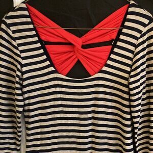 B44 Dressed, Gray/Black Stripe, 3/4 Sleeve Dress with Red Twist back detail.