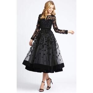 Features: Elegant tea-length cocktail dress with a semi-sheer illusion yoke and sleeves, tulle overlay skirt, and intricate velvet floral accents and beading throughout. A tonal velvet band accents the natural waist, and the skirt is finished with a velvet-trimmed bottom hem.