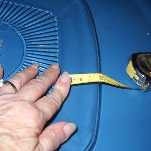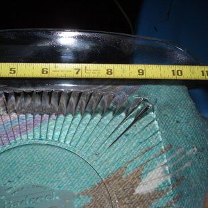 Weighs 2 lbs. and 13 oz. 12 in across the middle, 11 in. at the ends and a 2 in slant. I only see a couple tiny knicks in the center. Very light scratches center also.. NO BUNDLE DUE TO WEIGHT PLEASE