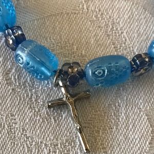 Stunning baby blue bracelet with the sign of the cross! Has been worn once before at Church camp, the wear is normal and can be seen above in the photos! Would be a super cute addition to any closet!