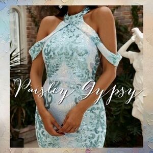 TAGS- BABY BLUE, TRENDING HOMECOMING, TRENDING MERMAIDCORE, BAROQUE PATTERN, HALTER, SLEEVELESS, WEDDING, BLACK TIE,