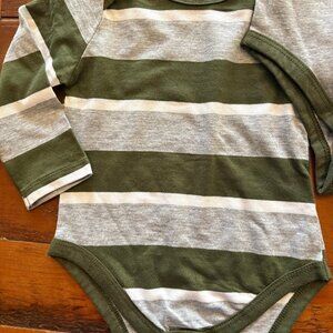 4 PIECE OLIVE STRIPE CLOTHING SET: BIB, 2 LONG SLEEVE ONSIES AND PANTS SIZE 6/9MO
