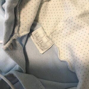 Rare vintage BABY DIOR set from the iconic Paris/New York label—made in the USA and beautifully preserved. Includes two luxe infant outfits: a white hooded footed romper (8 months) and a blue cotton hooded 2-piece set (12 months). Perfect for designer collectors or heirloom gifting.
