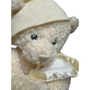 This cute bear is ivory in color. Hes very clean. He has his nightcap as well as his blanket. He winds up in his head moves while playing Brahms lullaby. Measures 12 inches. There are flowers and leaves embroidered on the blanket. The blanket also has satin binding. Eyes and nose are embroidered.