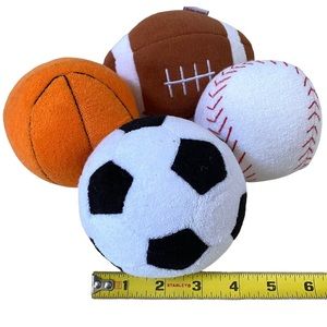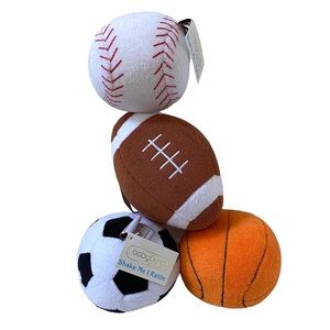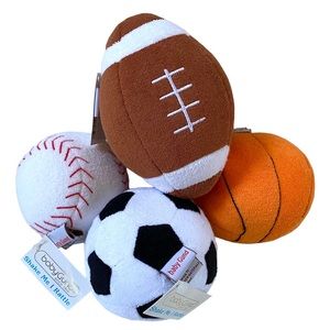 —FEATURES: RATTLE inside the plush baseball, football, soccer ball and basketball (watch posted video to see and hear this rattle which is the very same rattle/sound inside each of these rattles.)