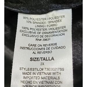 This is size 2X and made by Baby Phat. It is very gently worn, in like new condition, no rips or stains, might have some wrinkling with shipping. It is lightly lined and is covered in sequins. It is made with polyester and spandex and is hand washable. It measures approximately 27" across the bust and is 22 1/2" in length from the back of the neck. Very nice jacket.