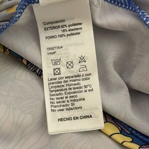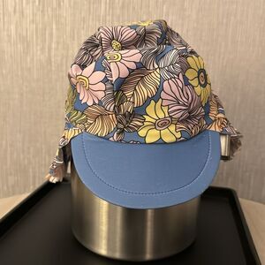 Flower power baby girl sun shield hat- size medium- has blue bill - ruffled shield/ covering comes down the back to protect the neck. Bright and colorful- polyester/Elastane blend - there is some pilling on the inside of the bill- see pics
