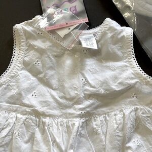 Embroidered and eyelet pattern. Attached bloomers with snap closure.