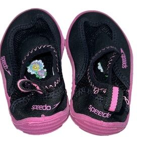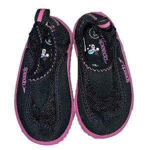 Like new because little 🦶 feet grow so quickly. These are black and pink, pull on, aquatic shoes size small 5/6. $10 or FREE with purchase of any list price, bathing suit from my closet!!
