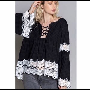 Plaid Woven babydoll Top Featuring Low neckline with Criss Cross Closure , Contrast scallop Lace Trim detailing on Sleeves and all throughout edged- finished with Long Bell Sleeve with Scallop Edge.