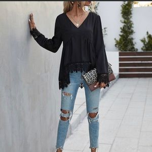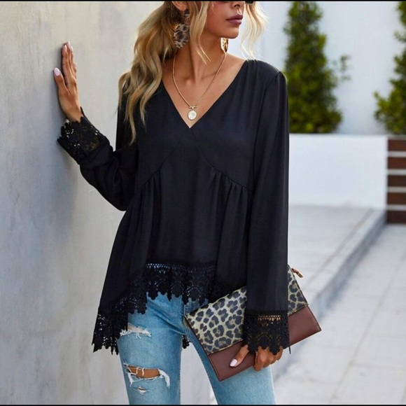 ππ€ BRAND NEW WITH TAGS BLACK BABY DOLL LACE DETAILED TOP!π€ This babydoll styled long sleeved boho chic shirt is perfect for a night out!! Itβs super lightweight! It cuts to a deep v-neck in the front. It has long semi-fitted sleeves with lace detailing on the ends (pictured). Also, there is lace detailing all around the bottom of the shirt (pictured). The shirt is shorter in the front & longer in the back. I accept reasonable offers! Please let me know if you have any questions! π€π€π₯°π₯°