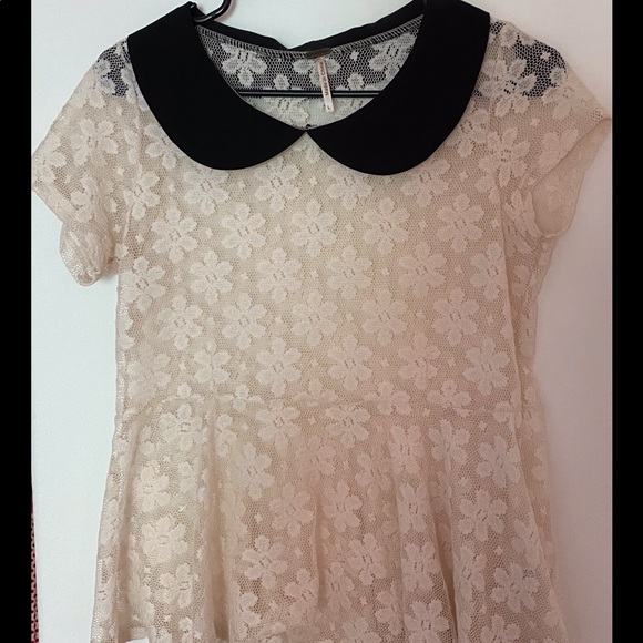 Cream, babydoll top with lace detail and black collar. Bought at TJ MAXX worn few times.