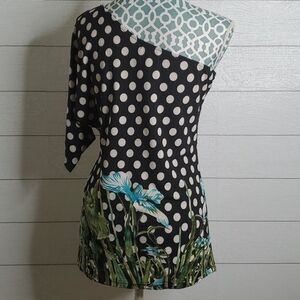 Asymmetrical black white Polk a dot with flowers and bling rhinestones throughout the front of the design