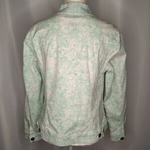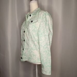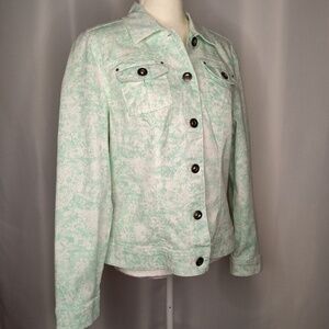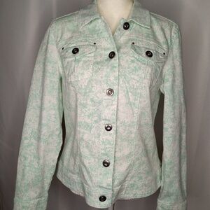 Button up jacket, green and white with jeweled like buttons, two chest pockets, Sz Large.