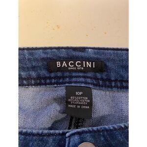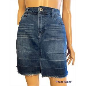 Pre Owned Excellent Condition, stretch denim mini to mid thigh, raw hem, front slit, 5pocket, size 10 petite, see pics for measurements for custom fit.