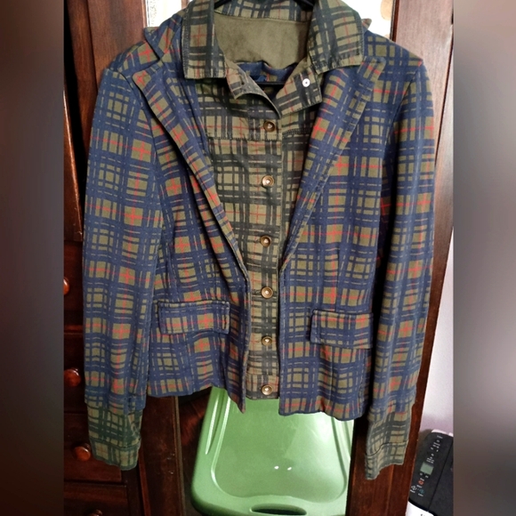Stylish plaid blazer that gives a layered look. Features a mix of blue, green, and red colors. Perfect for a chic look. Has adorable elbow patches.