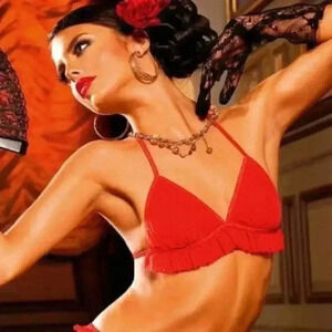 Delicate and flirty, this BACI LINGERIE triangle bra features sheer red tulle with ruffle detailing. Designed with adjustable straps and a soft elastic band, it offers a comfortable fit for various body types. Perfect for layering or adding a touch of romance to your lingerie collection.